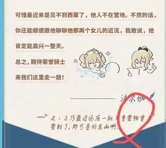总而言之,作为七神当中最神秘的那个神明也是从开局以来就卫星爆料最多的那个神明角色,她的塑造肯定是相当立体和丰富的,包括现在越来越多的主线剧情文本也都指向了这位神秘的冰之女皇,真的很期待到时候会是怎么样的一个人物设定。除此之外呢,有关于第二批蒙德角色加强的预告来了,虽然并不是官方明确官宣的加强预告,但是从这一封法尔伽的信件里面可以看到法尔伽说最近还有一批重要物资要运到蒙德,这些可是好东西,指不定就能借这个机会把西风骑士团的这一批成员也迎来技能升级跟加强,刚好这是一个很不错的借口。