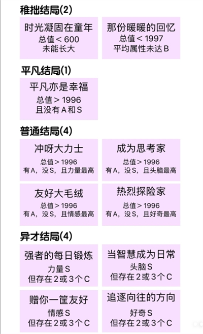 无限暖暖游戏中巨兽养成有8大类共35种结局,核心围绕力量、头脑、情感、好奇四个属性的等级与总属性值划分,还有隐藏结局,以下是对所有结局的达成条件解析。
