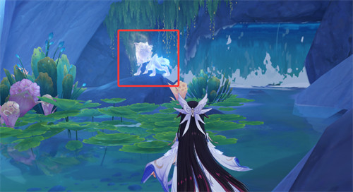 此处触碰狼的幽影,使其进入月凝壁障,引导獭懒羊移动至此处,并向月凝壁障投掷「种核」使獭懒羊对其释放一次强力的月矩力波使其融解,继续追随并送回。