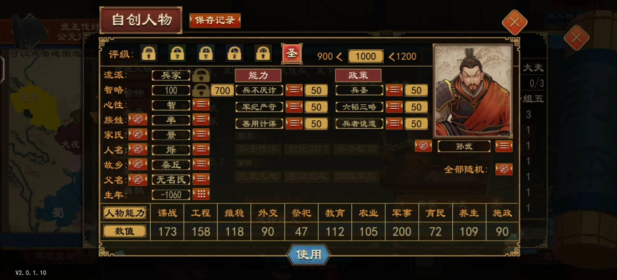 能力:兵不厌诈(必选),武峰,奇兵,励军,军纪严苛,善用计谋,刚愎自用
