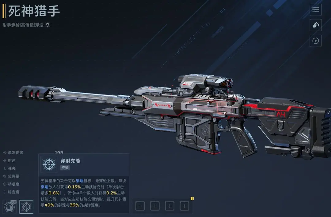 死亡猎手具备全模式通用性,综合强度表现稳定。开启主动技能后,角色进入狂热状态,能量条立即充满,期间射击不消耗弹药且射速提升,持续至能量耗尽为止。被动技能“强力弹药”支持最高6层穿透,每层穿透伤害不衰减,每次命中最多5个目标,并恢复10%弹夹容量;若在能量激活状态下触发该被动,则额外获得58%穿透伤害加成,随层数叠加最高可达98%。