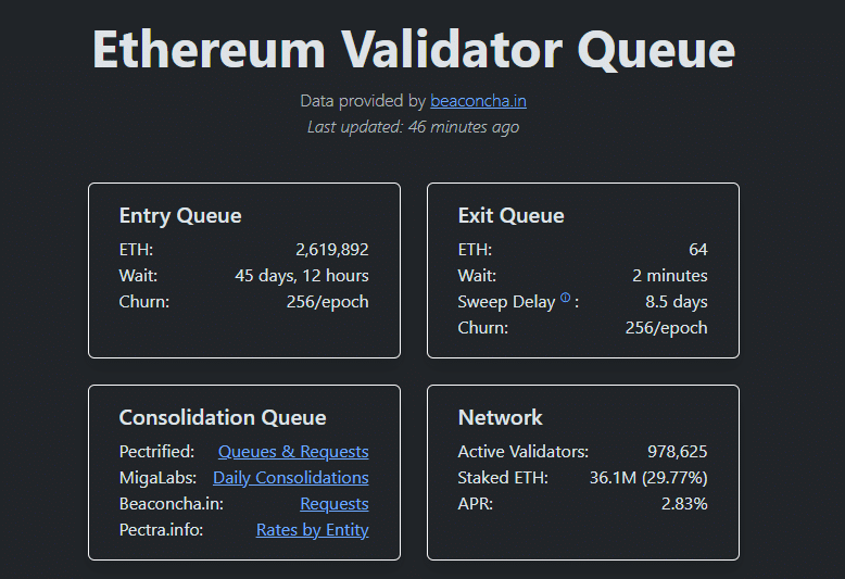 根据以太坊验证者队列,仍有更多质押在等待中。超过260万枚ETH处于进入队列,等待时间延长至45天12小时。然而,退出队列中仅有64枚ETH,验证者似乎对解除质押不感兴趣。
