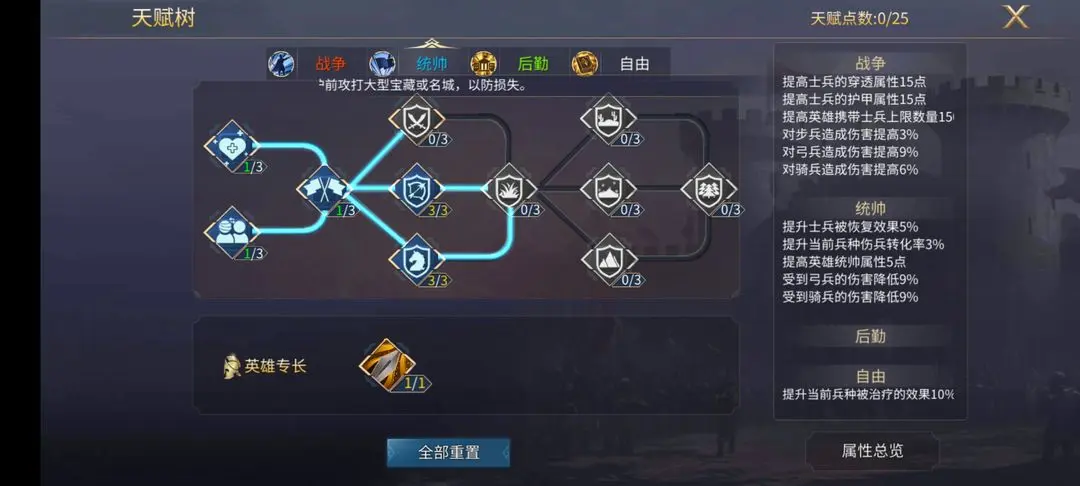 ③ 在统帅的第三排,优先点满“弓兵减伤”,其次是“骑兵减伤”,最后是“步兵减伤”