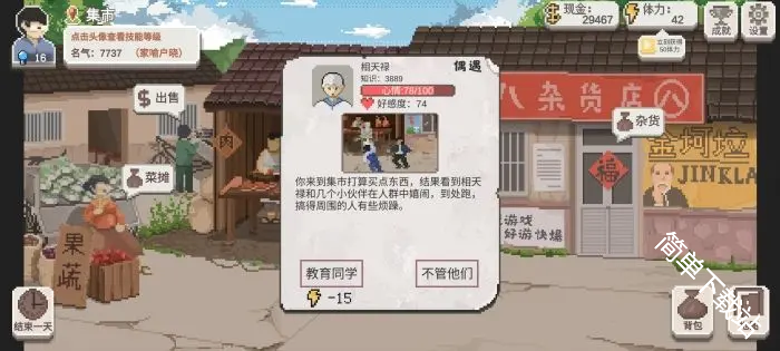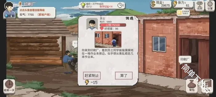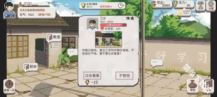 选择【制止他们】会消耗15点体力,自身名气+10、该学生心情-5(前期推荐去制止,名气会关系到学生资质)