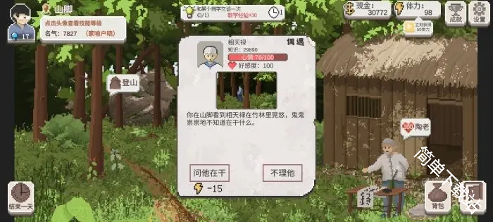 选择【问他在干嘛】会消耗15点体力,可得到3个竹笋(竹笋既可以用来做登山餐,卖了也能赚一笔)