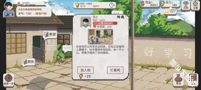 乡村老师游戏中随机事件可以提升学生的好感度,目前游戏内的几个地图除山涧外都包含有学生随机事件,不同的随机事件会有不同的选项,选择的内容不同会加成不一样的属性数值。下文列举这些随机事件以及对应的选项内容详情!