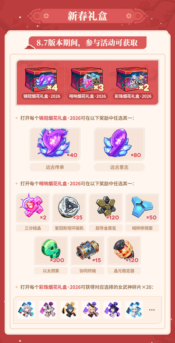 崩坏3新春福利预告,舰长好!《崩坏3》8.7版本「时岁叩晓」即将开启,今天为舰长带来8.7版本新春福利情报,快来一起看看吧~