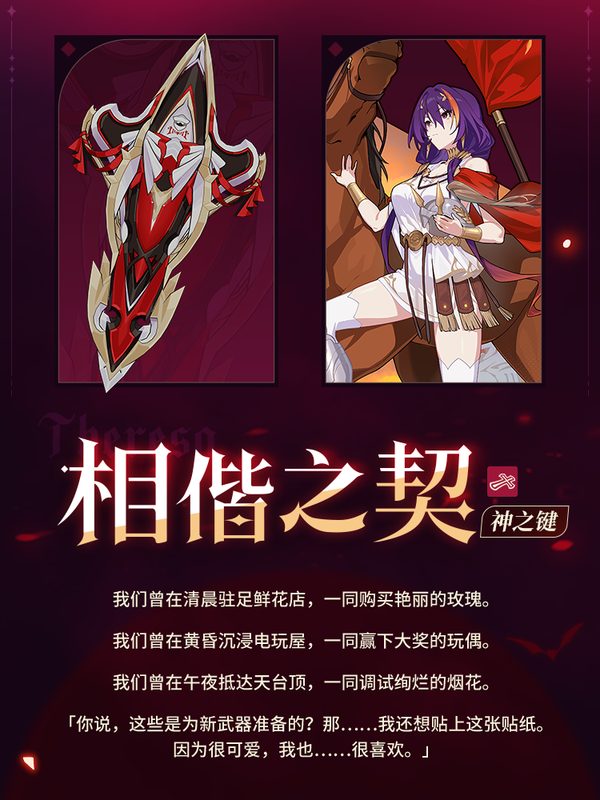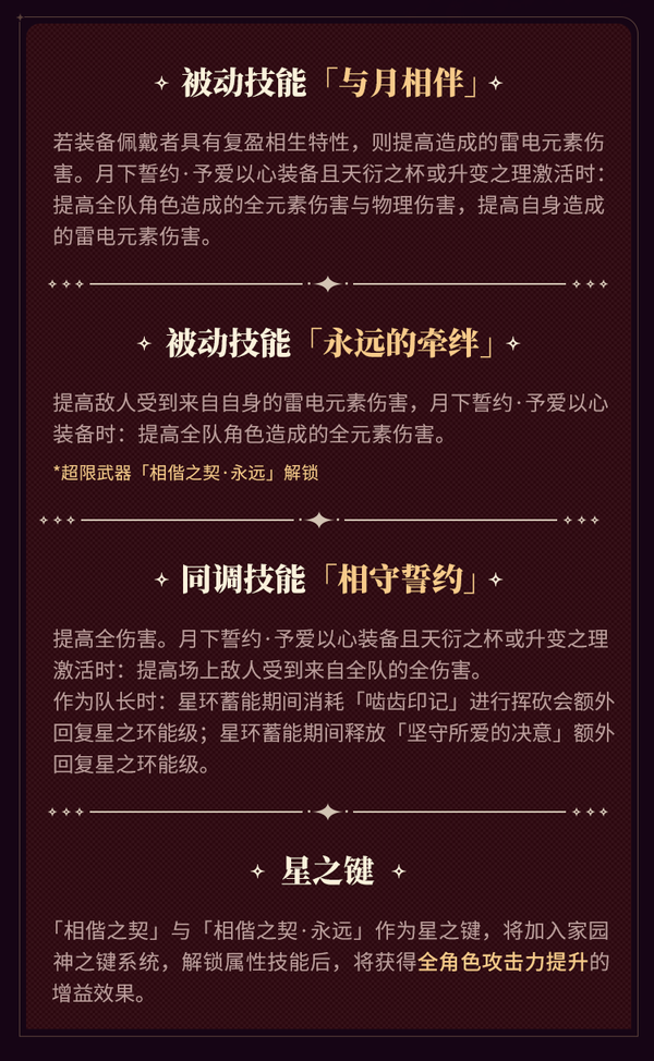 8.7版本更新后,神之键「相偕之契」及其超限神之键「相偕之契·永远」登场!月下誓约·予爱以心装备后将激活星之环分野·天衍之杯,并获得多种技能效果