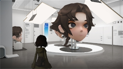 未来空间中有一些萌趣十足的房间,有的摆有工友模样的巨型人头像,点击切换还可以换成你自己的头像,有的被巨型萌猫占据。