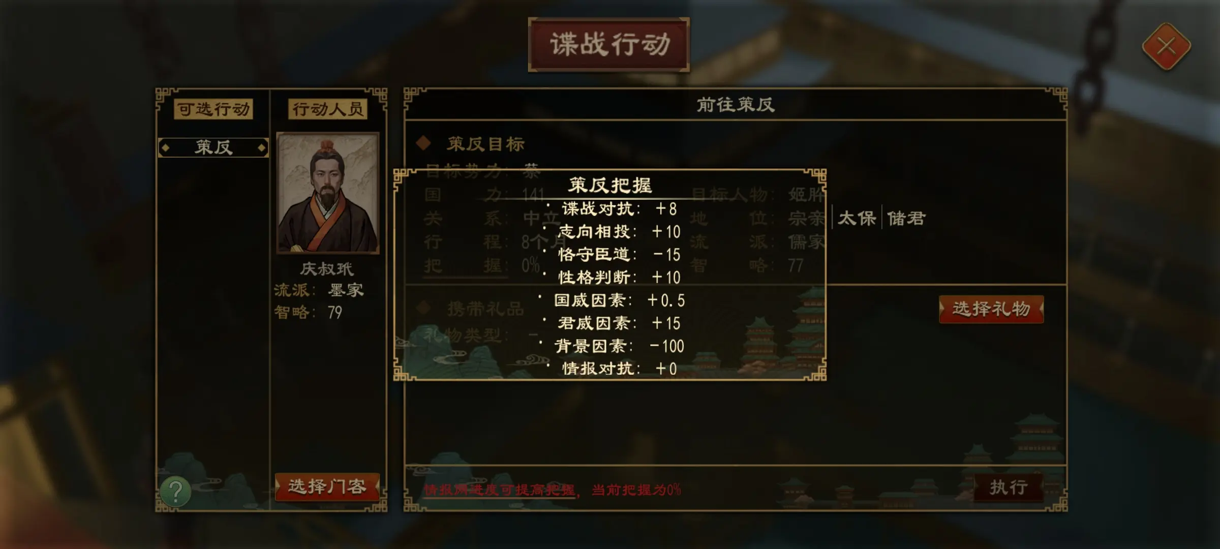 大周列国志怎么把贤才策反,游戏中可以查看影响策反把握的各个因素,当然还有一个礼物增益