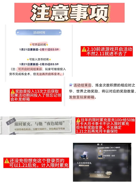 注意事项:开启活动时间、领取奖励时间、限时累充奖励