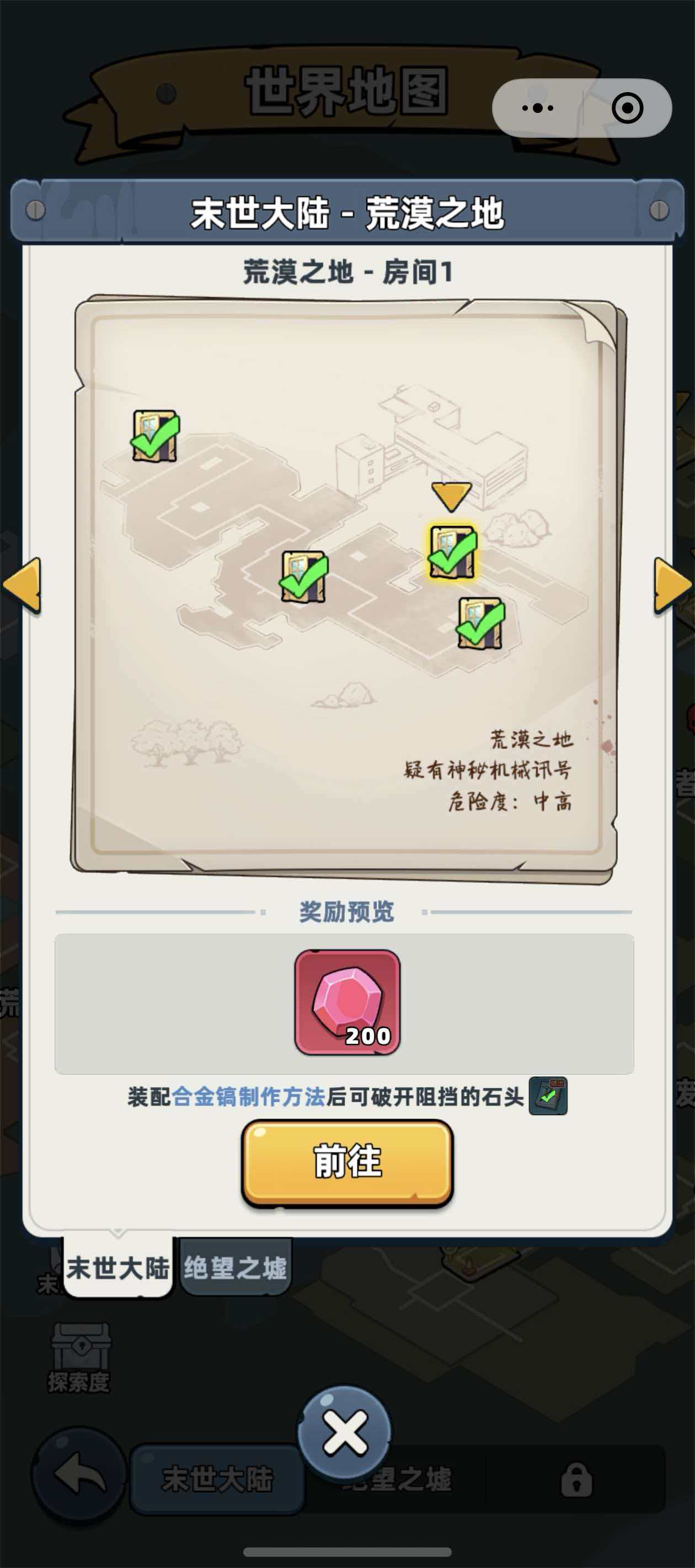 荒漠之地的钥匙并非散落于野外,而是集中分布于特定房间内。玩家需主动进入结构化房间开展探索。定位方式如下:点击界面右上角地图按钮,在地图左下角切换至“探索度”视图——该模式将完整显示荒漠之地所有已知可探索房间位置。点击任一房间图标,角色将瞬移至该房间入口。需特别注意:每个房间均设有最低战力门槛,若当前战斗力低于要求值,系统将提示“战力不足”,无法成功进入或完成探索流程。
