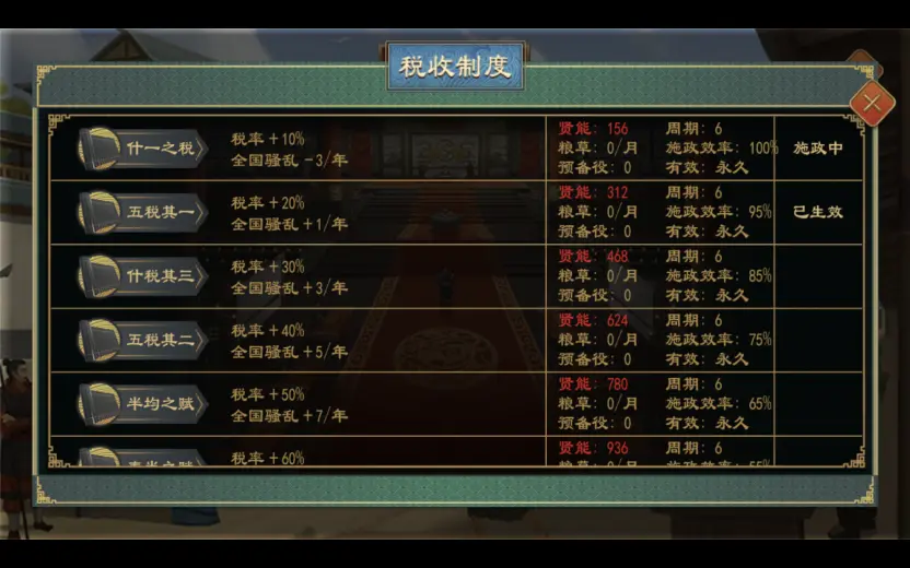 操作路径:【计府-赋役署-存粮/粮税-重订政策】通过重订税收制度政策,可以提高国家税率,从而提高每年粮食的获取量。前期可以将税率适当调高至30%左右,在后续粮草结余较多的情况下再将其下调。