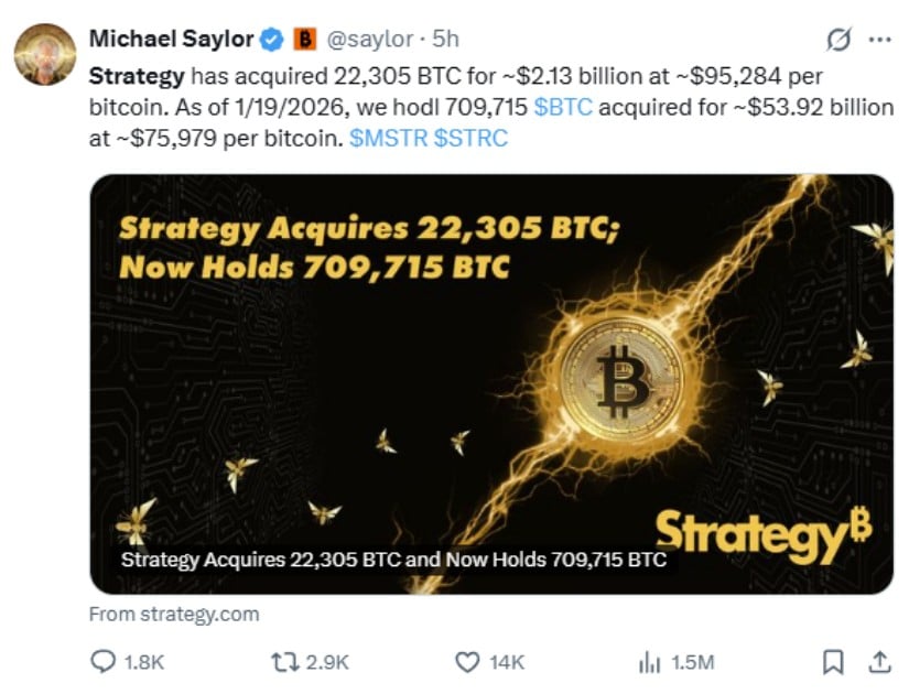 2026年1月20日,该公司宣布在1月12日至19日期间以约21.3亿美元购入22,305枚BTC,使其比特币总持有量达到709,715枚。