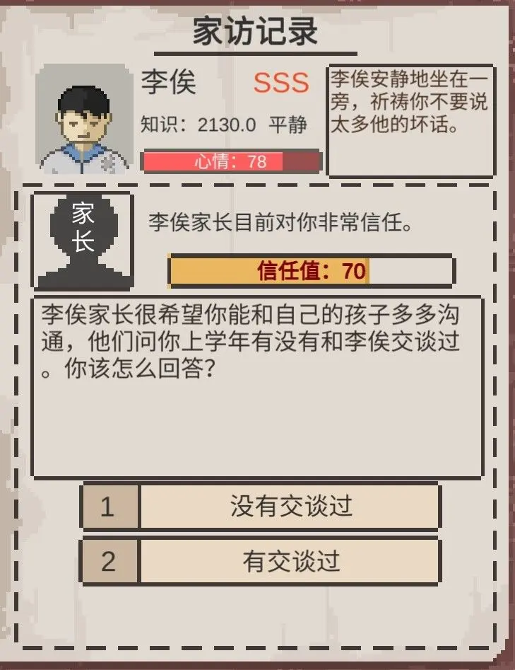 乡村老师家访玩法中不仅需要提前准备各种信息,还需要在对话问题中做出正确选项。在到达学生家前,会出现6种情况,不同情况下选择不同的内容也会有不同的属性数值增加,正式开启家访后会包含有4类问题,分别是性格问题、成绩问题、属性问题、其他问题。下文是对应的家访问题以及回答的答案选择建议!