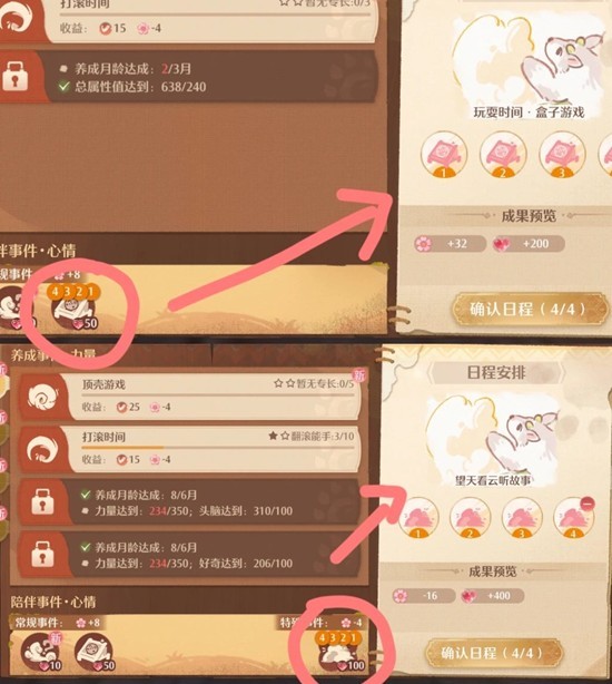 这次开始认真养,同时进行力量和头脑的培训,开创力量和头脑对应的游玩设施,睡觉吃饭这种恢复体力的也可以安排上,把力量和头脑刷到A,同时把对应两种设施各玩十遍,达成后又开始无脑刷亲密度就行