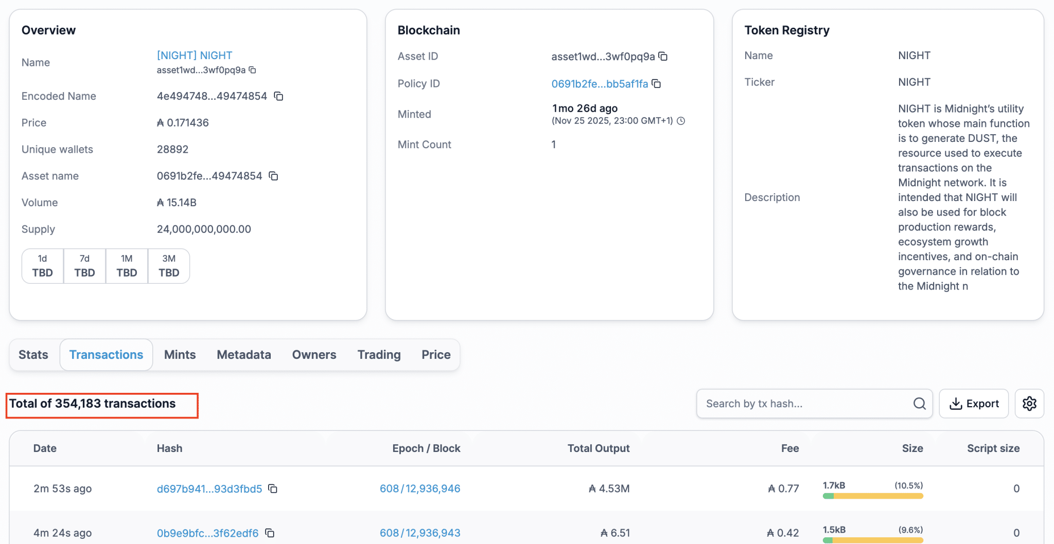 最新数据显示,当前大量Cardano交易均涉及NIGHT代币,包括转账及其他链上交互行为。