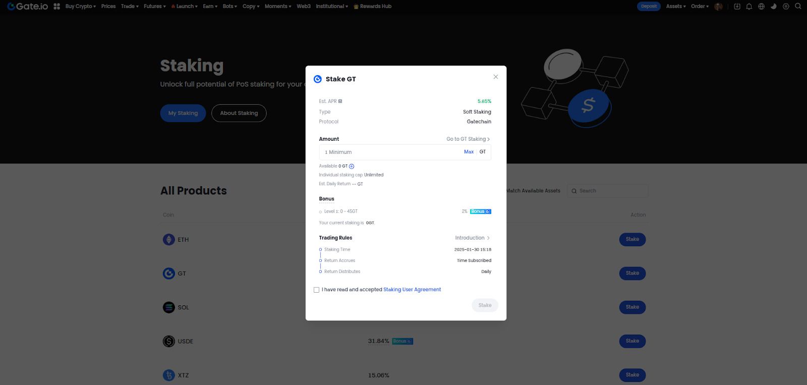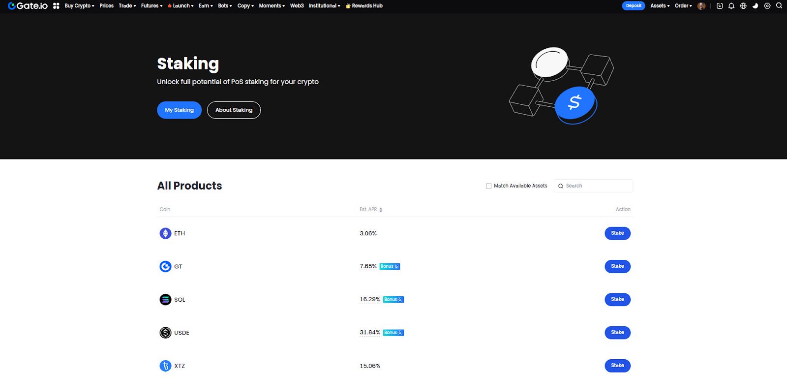 投资者可以在权益证明(PoS)区块链上锁定其加密资产,以支持协议的交易验证过程,并获得奖励。奖励通常以具有吸引力的利率或年化收益率(APY)的形式提供,具体取决于质押资产的数量和期限。此外,投资者还可以在提供质押服务的去中心化交易所(DEX)或中心化交易所(CEX)上进行质押。Gate.com提供加密货币质押功能,投资者可按照以下步骤操作: