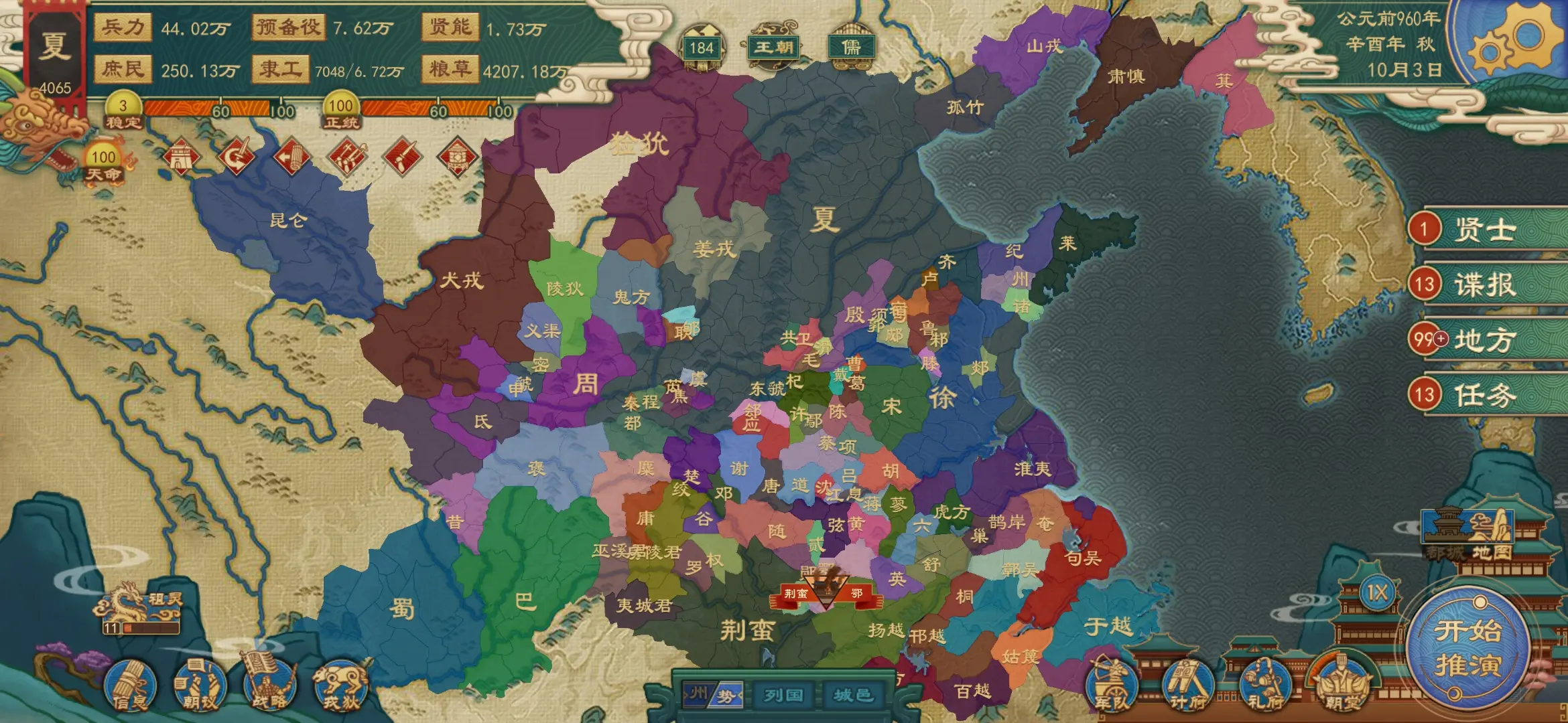 由于国家切换问题,门客贤能政策等会全部清零,开局比较艰苦,不过好在自带的圣人会在第二个月过来投靠你