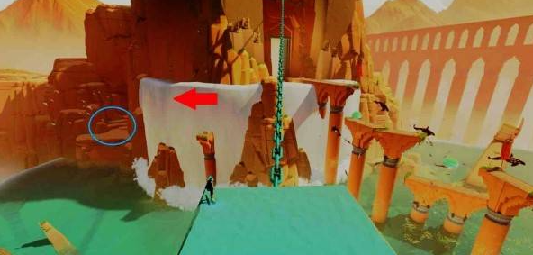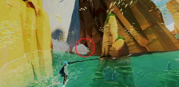 激活主水源点解锁右侧锁链后,绕到建筑后方利用海草跳到瀑布上,从瀑布顶端沿着右侧悬崖前进,直到看见悬崖旁边的石头路,在最右侧石头路往下方看可以看到悬崖上的旗子,旗子旁边的洞窟内可以找到贝壳。