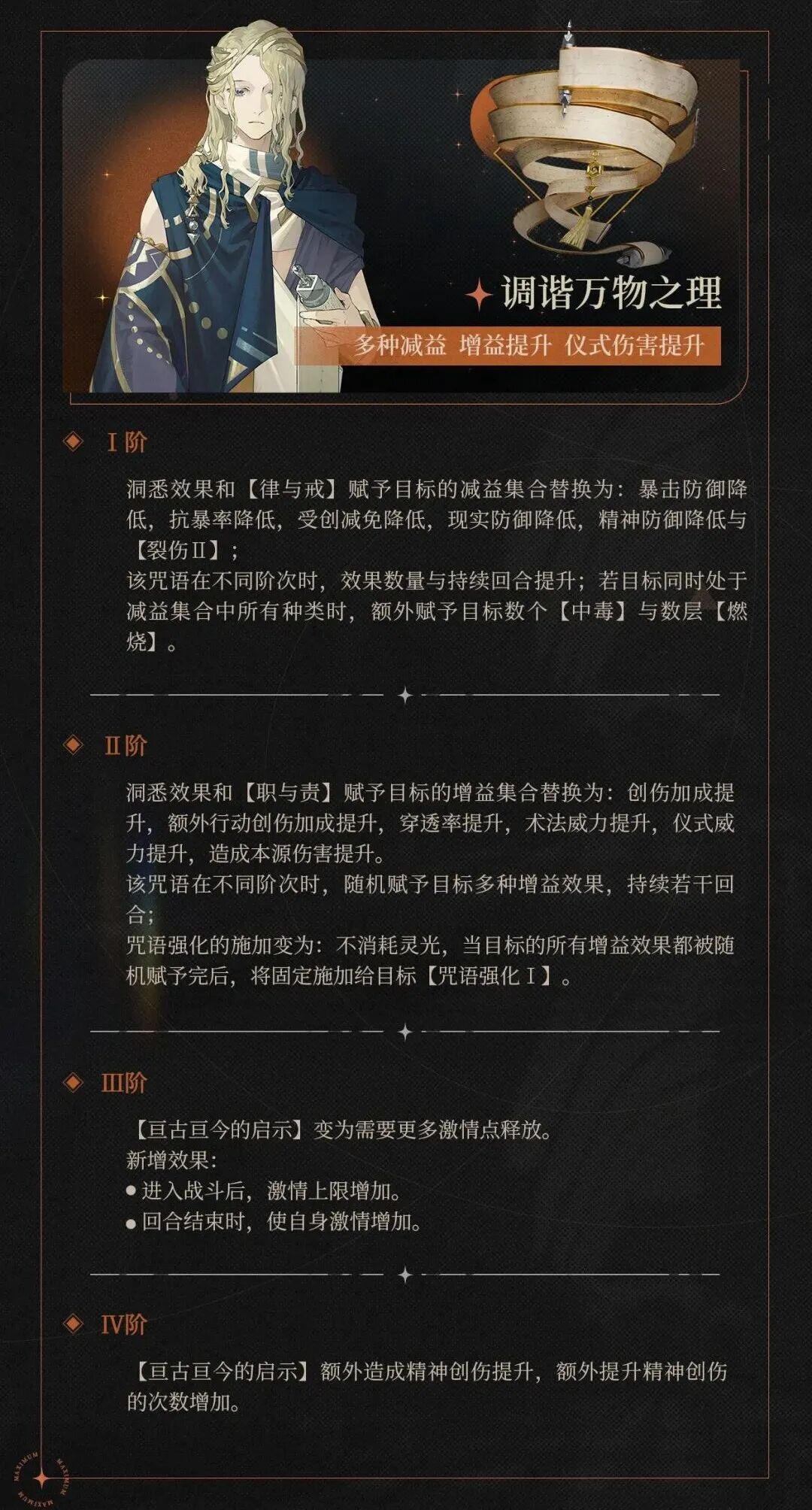 增益集合去掉了双防提升、痊愈1和反震1,新增了创伤加成、额外行动创伤加成、仪式威力和本源创伤提升。高阶2技能赋予的buff数量和持续回合提升。