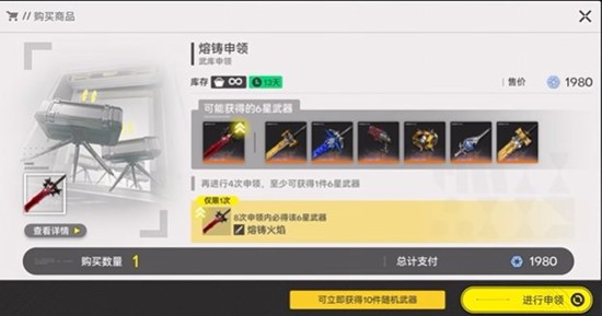 · 每申领1次,可随机获得全部可能出现的武器列表中的10件武器,其中必定包含5星或以上武器。