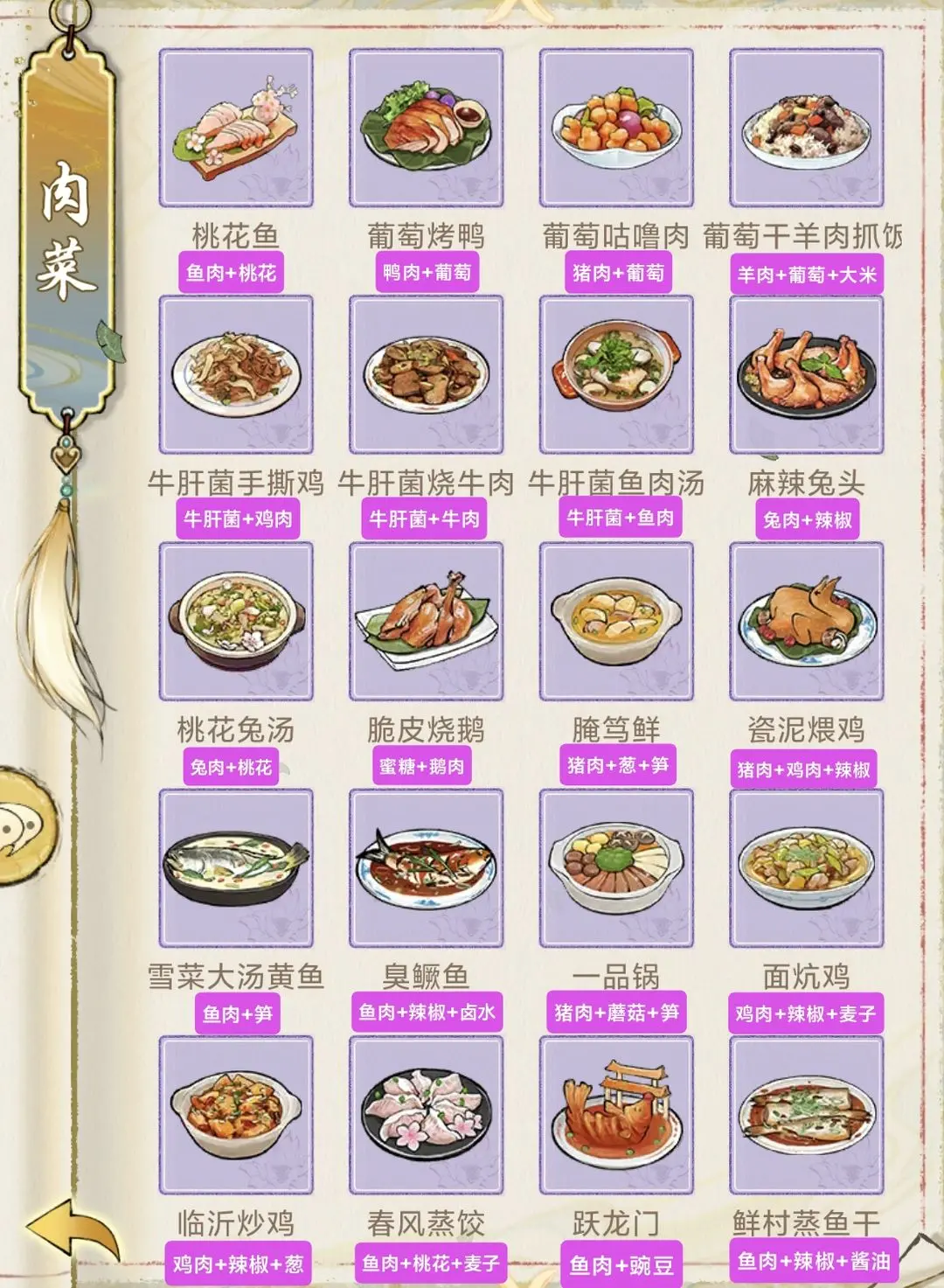 华夏千秋菜谱分为肉菜、素菜、甜品、酒四大种类,每一个菜品都需要使用相对应的食物材料来进行合成制作,下面为大家整理收集了详细的游戏中各个菜品的详情制作配方内容!