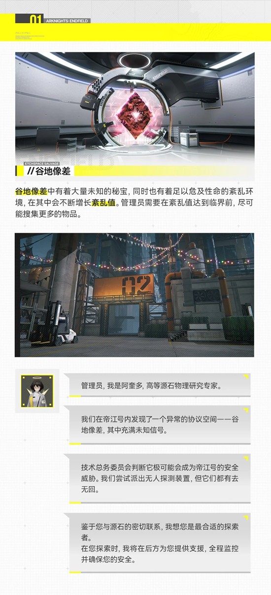 谷地像差中有着大量未知的秘宝,同时也有着足以危及性命的素乱环境,在其中会不断增长紊乱值,管理员需要在紊乱值达到临界前,尽可能搜集更多的物品。
