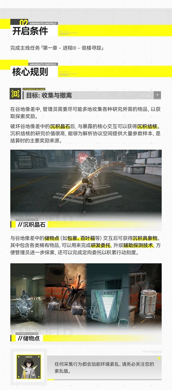明日方舟:终末地「蚀像寻遗」玩法介绍来了~危机与珍宝,偏差与演化……请在足以危及性命的紊乱环境中一探究竟吧,管理员。谷地像差中有着大量未知的秘宝,同时也有着足以危及性命的素乱环境,在其中会不断增长紊乱值,管理员需要在紊乱值达到临界前,尽可能搜集更多的物品。