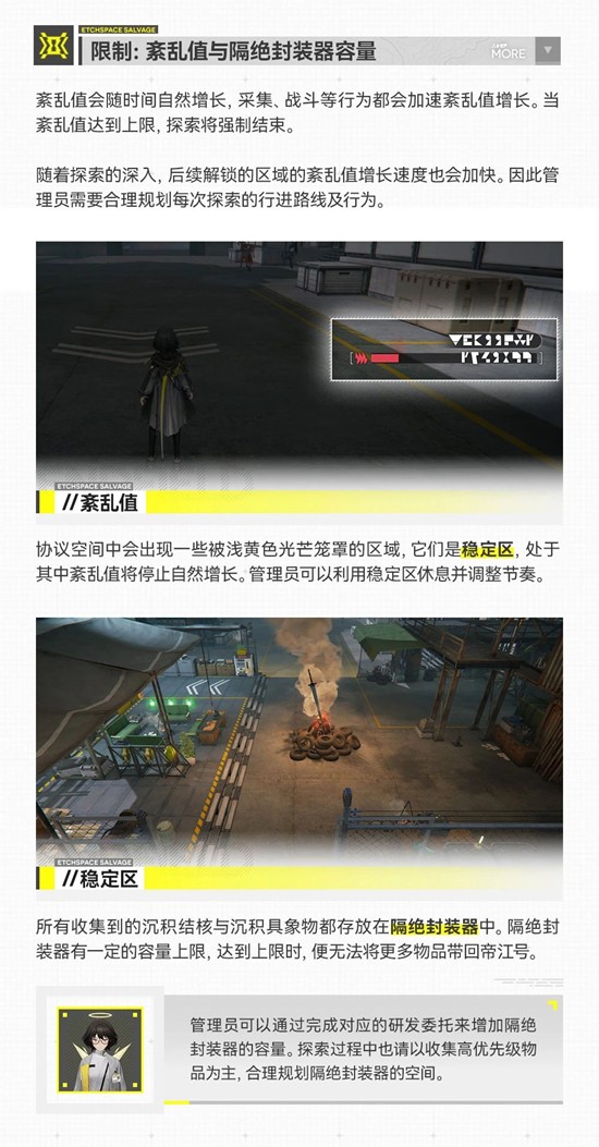 协议空间中会出现一些被浅黄色光芒笼罩的区域,它们是稳定区,处于其中紊乱值将停止自然增长。管理员可以利用稳定区休息并调整节奏。