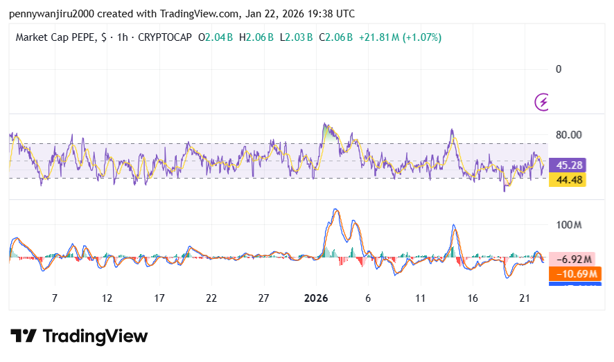 PEPE价格在0.0549美元附近窄幅盘整,相对强弱指标(RSI)呈现中性,MACD释放看跌信号,但对比特币和以太坊展现出适度相对强势。