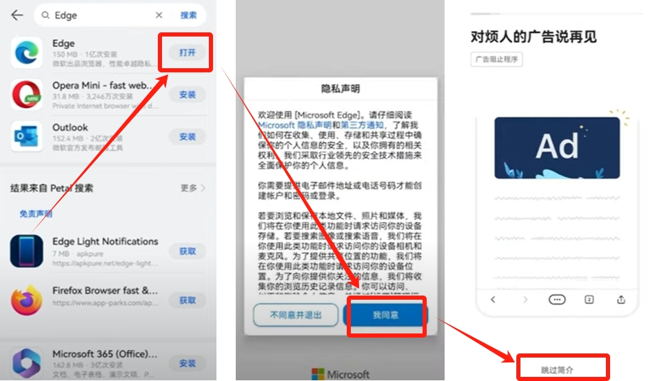 在安卓设备上安装EDGE浏览器是第一步,选择安装量超1亿次的正版应用。