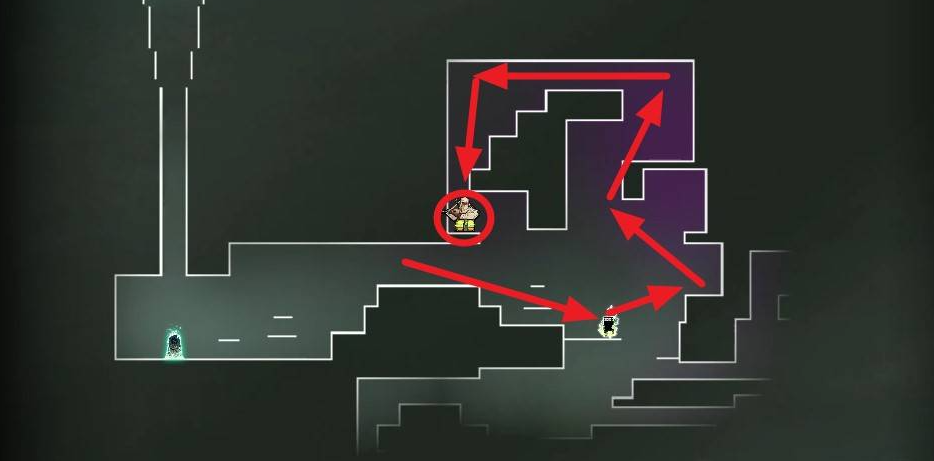 2、继续沿着红色箭头走右侧通道,绕到上层会找到最后一支【精英b队】。将其击败可获得【实验室钥匙】,回到下方岔路,跟着蓝色箭头走,不远处就是地图BOSS房。