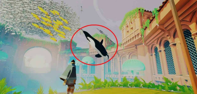 在开阔区域归位海水并激活左侧锁链后,水域中会出现许多鱼群,其中包括会环绕区域游动的虎鲸,借助水母可以跳到虎鲸背上。