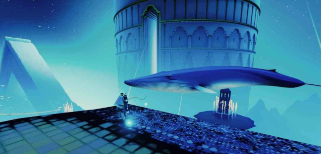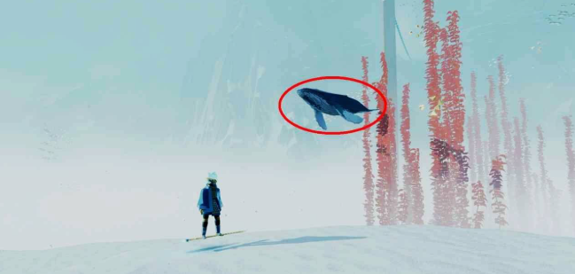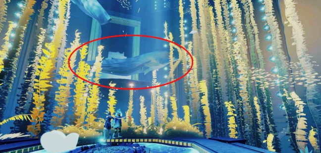 激活巨大雕像手上的水源点使海水归位后,区域中会出现许多鱼群,其中包含多只座头鲸,利用场景中新生成的海草跳到座头鲸背部。