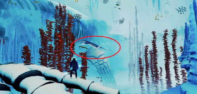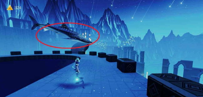 在巨大船骸顶部激活水源点恢复水流后,此区域会出现许多鱼群,其中包含多只鲸鲨环绕船骸游动,看准时机跳到鲸鲨背部即可。