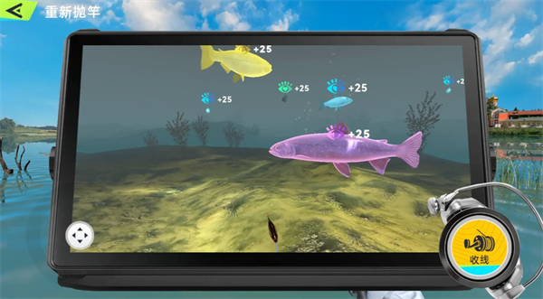 路亚的钓场环境一般是浅水域,还有很多障碍物,抛竿方式也和常规钓不同,需要注意路线有无障碍物遮挡。抛竿后需要用探测器看水下鱼的游动情况,操控拟饵来诱鱼咬钩,不过这个操作还是有点难度的,想钓大鱼需要耐心诱鱼。鱼咬钩后也不能放松警惕,需要连续摆竿刺鱼,后续就是遛鱼过程啦。