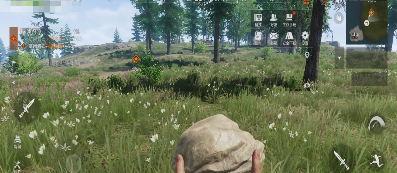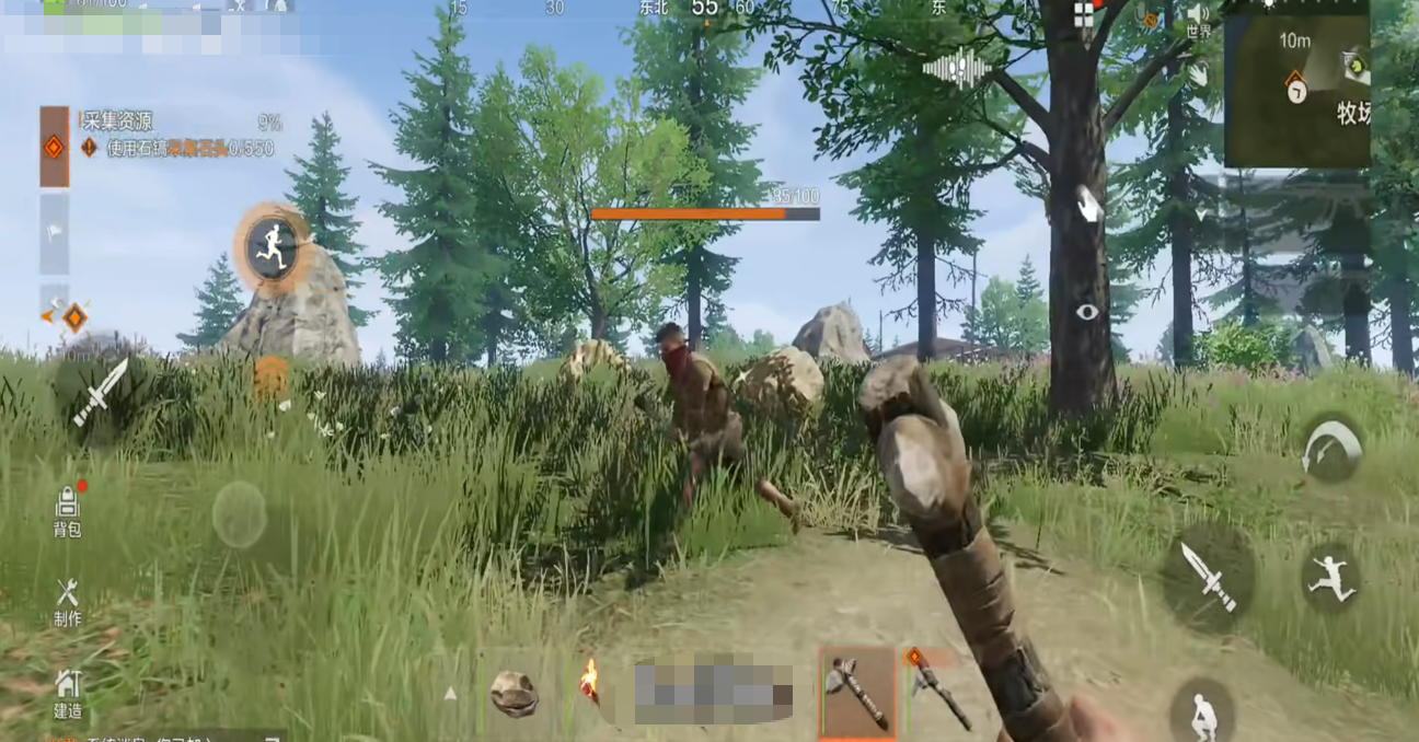 开局阶段,角色处于赤手空拳状态,首要任务是获取基础生存物资。通过徒手击打树木可采集木材,瞄准树干上的红色标记点能显著提升采集效率。积累一定经验后,可制作石锤,大幅提升伐木速度;中后期则可挖掘各类矿石,用于锻造高阶武器与升级庇护所结构。