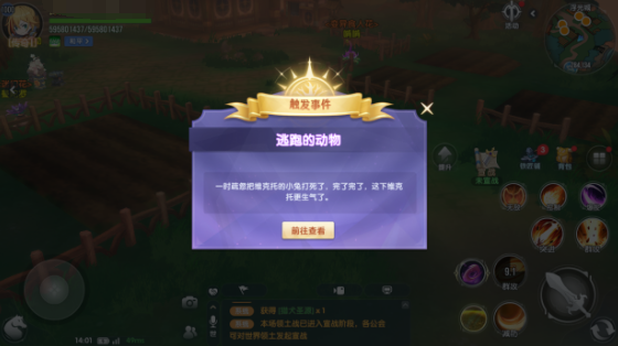 任务目标随即更新为寻回三只逃离的动物:小猫、小狗与母鸡。它们分别分布在农场不同方位,位置固定且可见度较高,难点在于交互逻辑——每只动物需在其所在点位静立等待满10秒后,方可点击对话完成互动。例如:发现小猫后原地停留10秒再交互;随后前往小狗位置,同样计时后操作;最后定位母鸡,执行相同流程。三项交互全部成功后,任务即告完成。