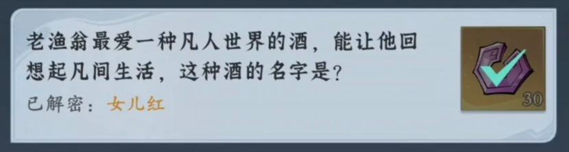 4、老渔翁最爱一种凡人世界的酒,能让他回想起凡间生活,这种酒的名字是?女儿红