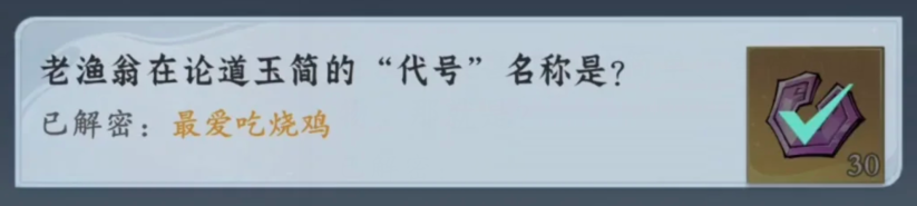 6、老渔翁在论道玉简的“代号”名称是?最爱吃烧鸡