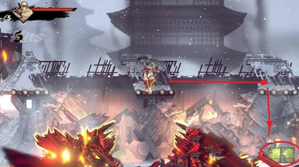 超级忍反攻的斩击里的火炎需要先来到胧之村,击败其中的敌人,右边穿过石碑并激活后可以看到有许多的宝箱可以获取其中的奖励,跳到雪地区域后需要在平台上一个个跳过去,穿过陷阱区域看到一个锁着的宝箱,攻击宝箱获得忍法火炎。