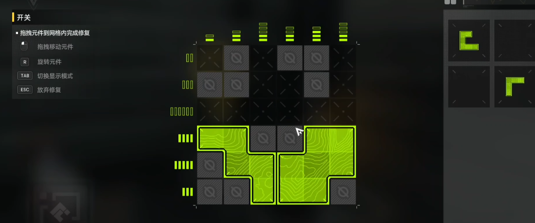 维修系统的设计融合了空间逻辑与动态策略。当玩家靠近失能机器人时,界面将激活专属解谜模块:以类俄罗斯方块的拼合机制为基础,要求玩家将不同形态的几何模块精准嵌入指定网格区域。每处接口对模块朝向、覆盖格数及相邻组合均有明确限制,需反复旋转、位移与试错才能达成完整通路。