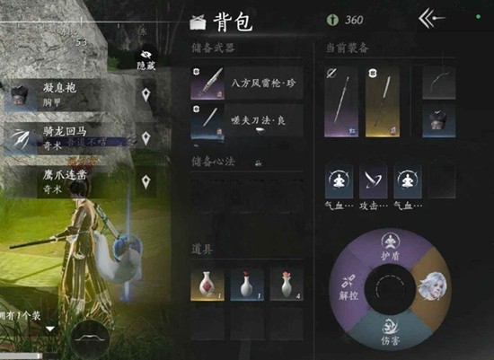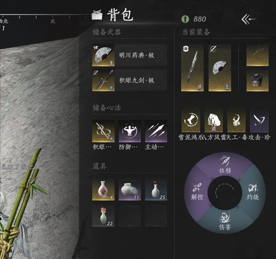 抓小鸡(小十七):无视防御和卸势的单体击飞,可以在硬直中使用,自身血越少伤害越高。命中会让对方掉一本心法,短时间内捡不起来(cd为30s)。