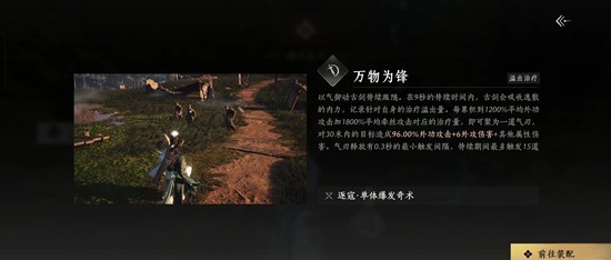 以气御动古剑特续跟随。在9秒的特续时间内,古剑会吸收逸散的内力,记录针对自身的治疗溢出量。每累积到1200%平均外功攻击加1800%平均牵丝攻击对应的治疗量,即可聚为一道气刃,对30米内的目标造成96.00%外功攻击+6外攻伤害+其他属性伤害。气刃释放有0.3秒的最小触发间隔,特续期间最多触发15道