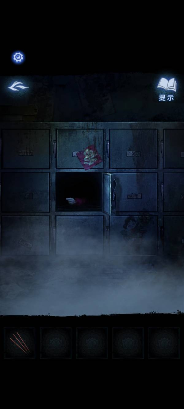 4、进屋后会发现墙壁上有壁画,根据壁画所在位置提示,打开左下方的木柜子,得到红色小人,黑色锦旗;