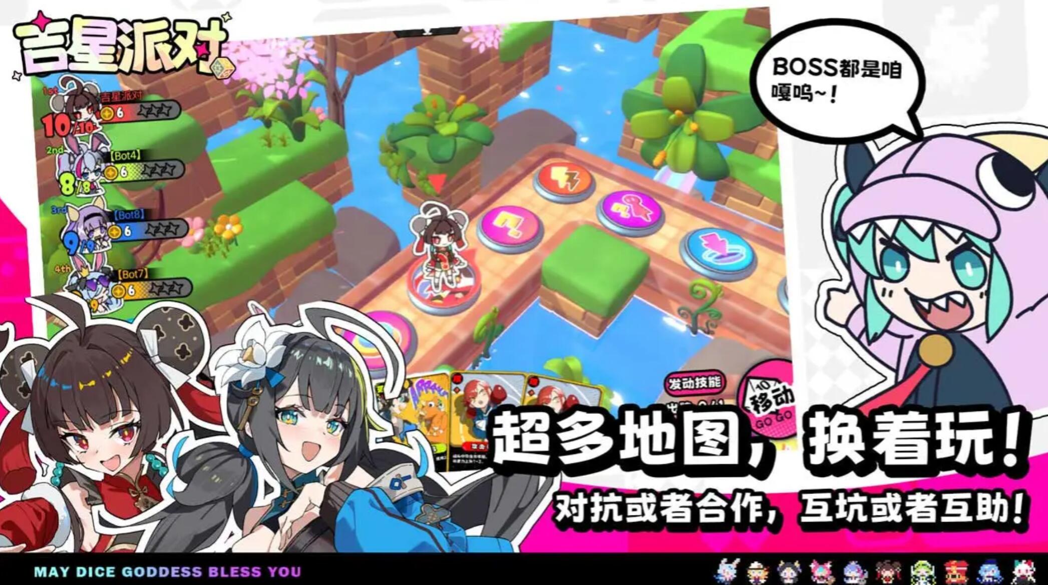 本作采用清新明快的二次元美术风格,界面简洁、角色生动,适配移动端触控操作逻辑。支持本地及在线4人同屏竞技,涵盖多种匹配模式。无论与熟人组队协作,还是随机匹配对手,都能快速进入状态。核心玩法融合大富翁式行棋机制、策略卡牌调度、角色专属技能释放以及动态事件触发,兼顾轻松氛围与深度决策需求。