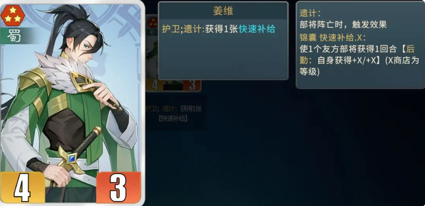 防御端建议配置姜维。其护卫效果需配合补给类武将才能完全释放潜力,每回合依赖资源支持来强化护盾强度。与曹操组合后,可大幅缓解前排承伤压力,让核心输出单位获得更安全的输出环境。最终补足阵容闭环的为徐庶,其存在确保全队在高费用阶段仍能维持资源供给节奏,尤其在启用六费卡时,徐庶提供的增益上限将显著抬升整支队伍的综合强度。