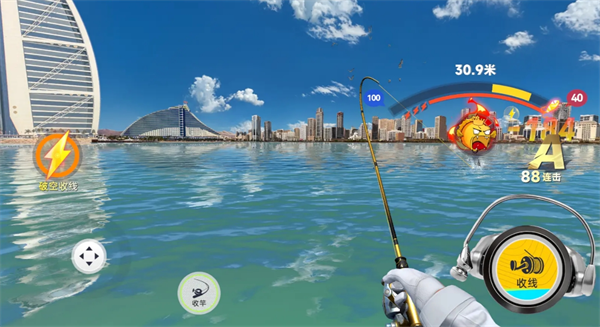收线过程具有一定的操作技巧。一方面,需要尽量保持连竿,快速蓄满能量,获得收线大招。另一方面,应把握好收线大招的释放时机。前期可能会遇到鱼的距离频繁接近逃脱阈值,此时不宜吝啬收线大招。利用大招可将鱼拉回一定距离,玩家可借此机会再次蓄积大招,最终成功将鱼钓上岸。