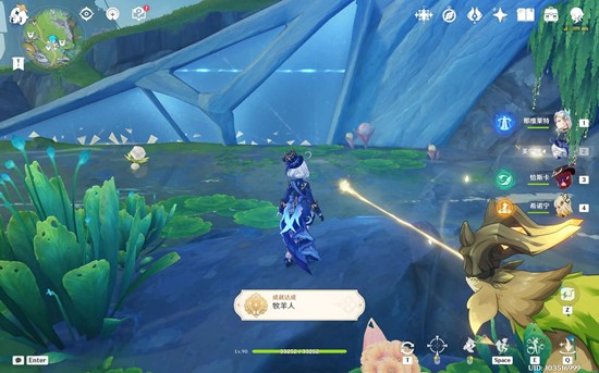 来到挪德卡莱传送点后朝小河方向走,河中央可见一只狼魂钻进南侧屏障。确认未获取后去北方向山坡牵引羊只,靠近按交互键牵引。一直牵着约20秒可获得成就牧羊人。将羊牵回屏障处,长按攻击键瞄准释放撞开屏障,调查黄色调查点后跟随狼魂奔跑,终点获得普通宝箱。